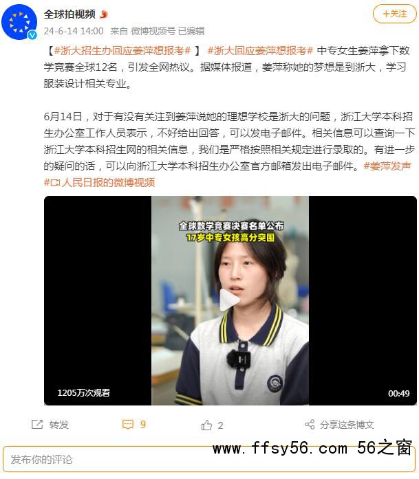 【#浙大招生办回应姜萍想报考# 】 #浙大回应姜萍想报考# 中专女生姜萍拿下数学竞赛全球12名,引发全网热议。据媒体报道,姜萍称她的梦想是到浙大,学习服装设计相关专业。
