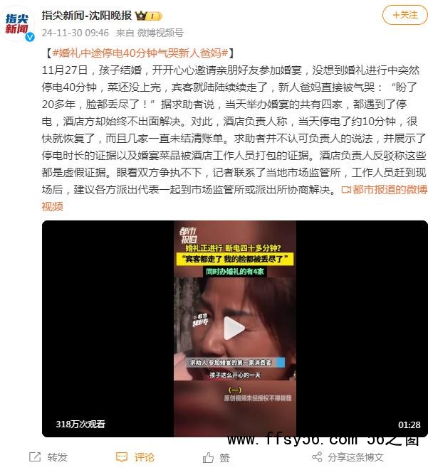 【婚礼中途停电40分钟气哭新人爸妈】11月27日。孩子结婚,开开心心邀请亲朋好友参加婚宴,没想到婚礼进行中突然停电40分钟,菜还没上完,宾客就陆陆续续走了,新人爸妈直接被气哭:“盼了20多年,脸都丢尽了!”据求助者说,当天举办婚宴的共有四家,都遇到了停电,酒店方却始终不出面解决。对此,酒店负责人称,当天停电了约10分钟,很快就恢复了,而且几家一直未结清账单。求助者并不认可负责人的说法,并展示了停电时长的证据以及婚宴菜品被酒店工作人员打包的证据。酒店负责人反驳称这些都是虚假证据。眼看双方争执不下,记者联系了当地市场监管所,工作人员赶到现场后,建议各方派出代表一起到市场监管所或派出所协商解决。