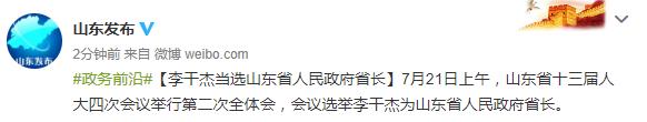 据山东发布官博消息,7月21日上午,山东省十三届人大四次会议举行第二次全体会,会议选举李干杰为山东省人民政府省长。