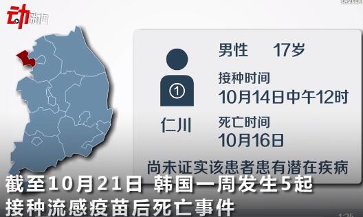 【韩国一周内5人接种流感疫苗后死亡】截至10月21日,韩国一周发生5起接种流感疫苗后死亡事件。20日,韩国疾病管理厅称,接种疫苗与死亡病例是否存在因果关系尚未确定。9月起,韩国政府决定为18岁以下和65岁以上人群免费接种流感疫苗。由于运输过程中部分疫苗暴露于常温环境,9月22日,免费疫苗接种计划被紧急叫停,48万支涉事疫苗被回收。