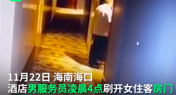 【酒店男员工凌晨刷开女住客房门】11月22日,在海南海口,一酒店男服务员凌晨4点刷开女住客房门。住客余女士表示自己21日与妹妹一同入住该酒店,因之前是委托朋友预定酒店,在入住时酒店并未要求其登记身份信息,22日凌晨4点余女士所在的房间门突然被陌生人刷开,余女士随后报警。