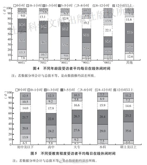 【国人日均在线休闲时间4.9小时】12月9日,中国社会科学院财经战略研究院、中国社会科学院旅游研究中心及社会科学文献出版社联合发布《休闲绿皮书:2019~2020年中国休闲发展报告》。报告指出,过去一年,国民平均每日在线休闲时间为4.9小时。不同年龄段人群,整体呈现年龄越小,在线休闲时间越长的特点。不同学历人群,整体呈现学历越低,在线休闲时间越长的特点。