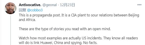 一些网友则认为,“这是一个宣传贴。美国中央情报局(CIA)以此破坏北京和非洲关系……他们(美国媒体)知道,读者会把华为、中国和间谍活动联系起来。毫无事实依据。”