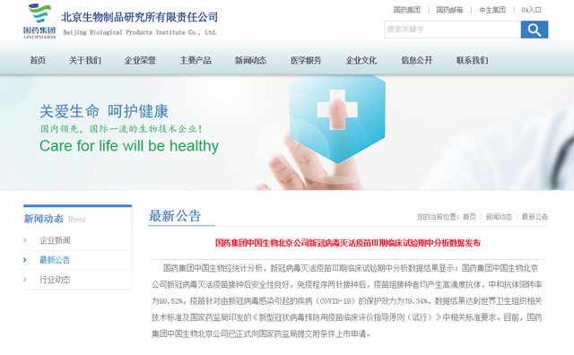 【新冠灭活疫苗三期试验期中数据公布】国药集团中国生物经统计分析,新冠病毒灭活疫苗Ⅲ期临床试验期中分析数据结果显示:国药集团中国生物北京公司新冠病毒灭活疫苗接种后安全性良好,免疫程序两针接种后,疫苗组接种者均产生高滴度抗体,中和抗体阳转率为99.52%,疫苗针对由新冠病毒感染引起的疾病(COVID-19)的保护效力为79.34%,数据结果达到世界卫生组织相关技术标准及国家药监局印发的《新型冠状病毒预防用疫苗临床评价指导原则(试行)》中相关标准要求。目前,国药集团中国生物北京公司已正式向国家药监局提交附条件上市申请。