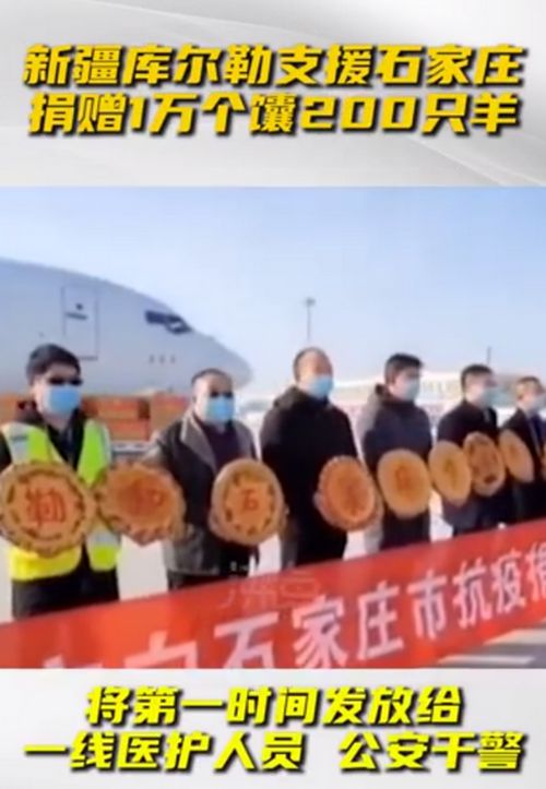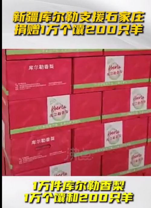 1月7日,新疆库尔勒市向石家庄支援10000件库尔勒香梨、10000个馕和200只羊。据悉,本批物资共计6吨。将第一时间发放给抗疫一线医护人员、公安干警。