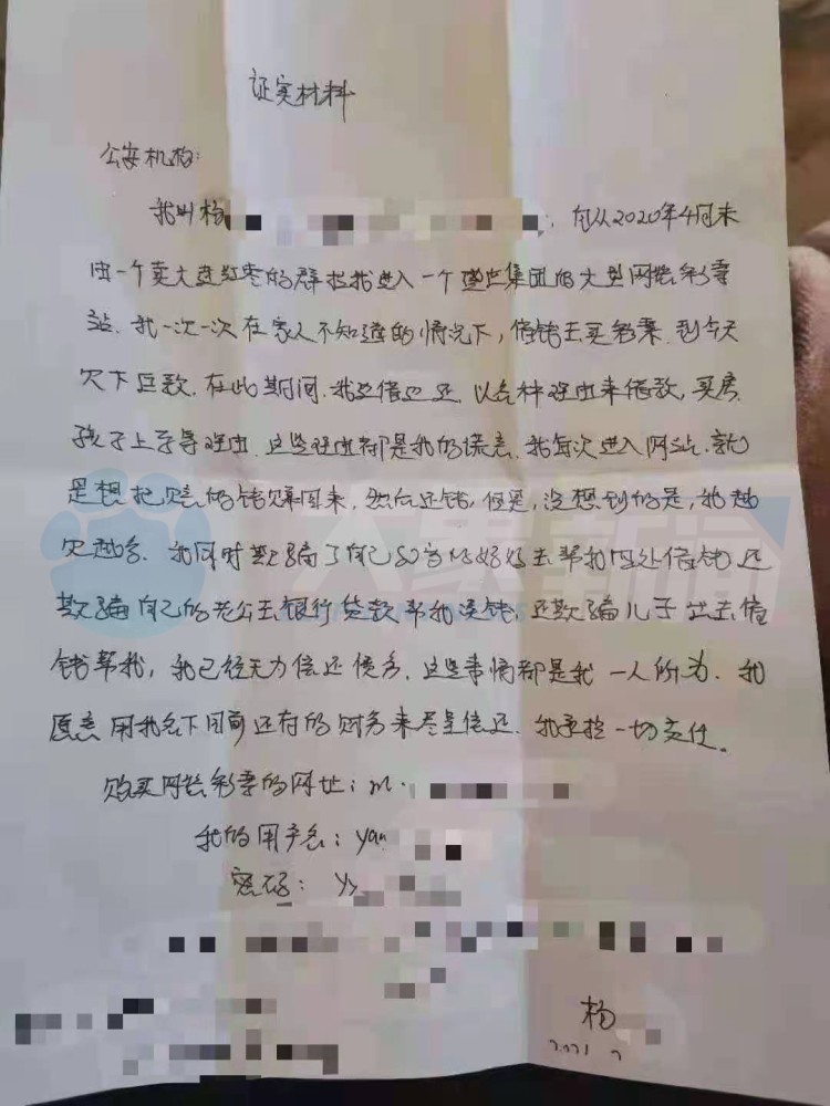 杨某遗书上写道,“自从2020年4月末,由一个卖大连红枣的群(群内网友)拉我进入一个大型网络彩票站,我一次一次在家人不知道的情况下,借钱去买彩票,到今天欠下巨款。我已经无力偿还债务,这些事情都是我一人所为,我愿意用我名下目前还有的财务来尽量偿还,我承担一切责任。”