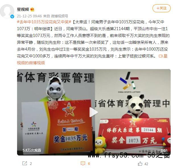 该男子表示,去年中1000还没花完,今年又中1000多万,希望明年继续。