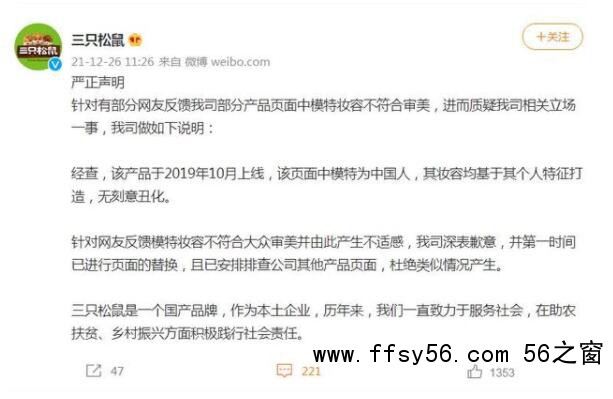 26日中午,三只松鼠发表声明称,经查,该产品于2019年10月上线,该页面中模特为中国人,其妆容均基于其个人特征打造,无刻意丑化。