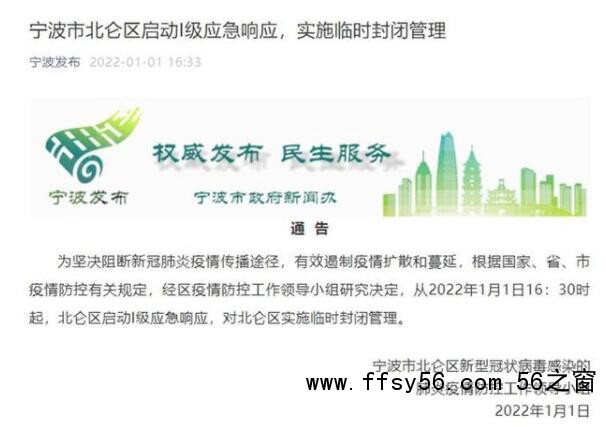宁波北仑区疫情形势发生变化后,北仑区新街道沿海村、申洲公司三部厂区及宿舍区被列为中风险地区。1月1日15时起,宁波市北仑区启动I级应急响应,实施临时封闭管理。同时,北仑区决定组织开展大规模核酸检测。