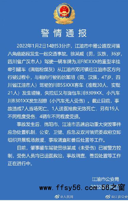 【四川江油发生严重车祸致8死19伤】江油公安通报:1月2日14时53分许,四川江油市中雁公路双河镇八角庙路段发生一起交通事故。徐某威(男,汉族,36岁,四川省广汉市人)驾驶一辆车牌为川F80XXX的重型半挂牵引罐车(满载粉煤灰)从江油市双河镇往江油市区方向行驶过程中,与相向行驶的徐某明(男,汉族,47岁,四川省江油市人)驾驶的川B55XXX客车(准载30人、实载21人)发生碰撞,失控后又与面包车川B309XX、小汽车川B301XX发生刮擦(小汽车无人受伤)。截至目前,事故造成7人当场死亡、1人送医抢救无效死亡,另有19人不同程度受伤,4辆车不同程度受损。