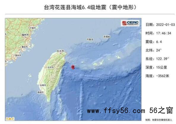 【台湾海域6.4级地震 福建震感强烈】中国地震台网正式测定:01月03日17时46分在台湾花莲县海域(北纬24.00度,东经122.39度)发生6.4级地震,震源深度15千米。
