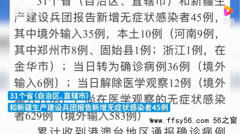 31个省(自治区、直辖市)和新疆生产建设兵团报告新增无症状感染者45例,其中境外输入35例,本土10例(河南9例,其中郑州市8例、固始县1例;浙江1例,在金华市);当日转为确诊病例36例(境外输入6例);当日解除医学观察12例(境外输入11例);尚在医学观察的无症状感染者629例(境外输入583例)。