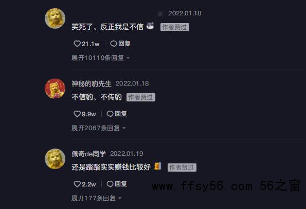 在评论中,网友纷纷调侃:“笑死了,反正我是不信”“不信豹,不传豹”“还是踏踏实实赚钱比较好”“还真有人信这个??”