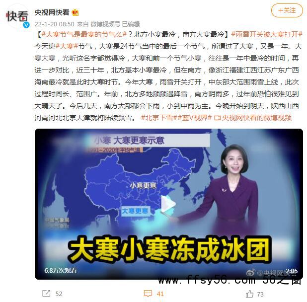 至于大寒节气,央视网快看科普表示,北方小寒最冷,南方大寒最冷。