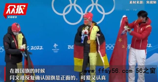 闫文港在领奖台上,发生了一个很有趣的小花絮:在披国旗的时候,闫文港反复确认国旗是正面的,可爱又认真。