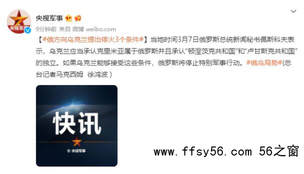 【俄方向乌克兰提出停火3个条件】从俄乌矛盾爆发至今已经半个多月了,双方还在寻求解决这个矛盾的方法,俄方也向乌克兰提出停火3个条件。
