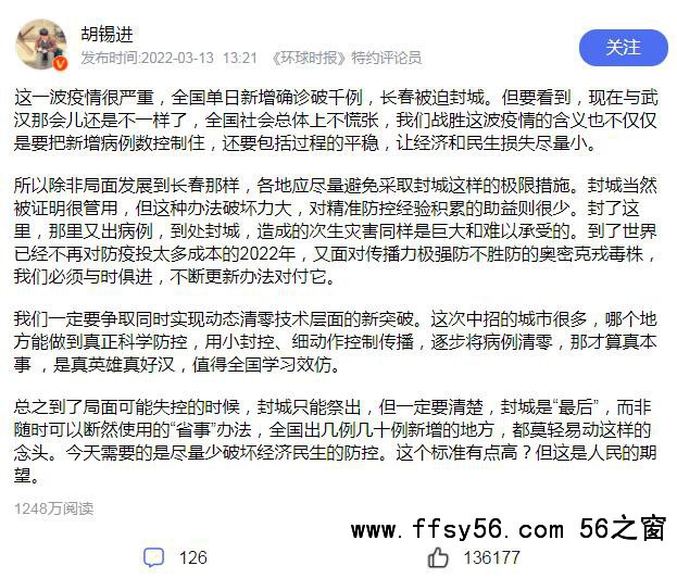 胡锡进:让人远离感染也远离封城 疫情什么时候结束